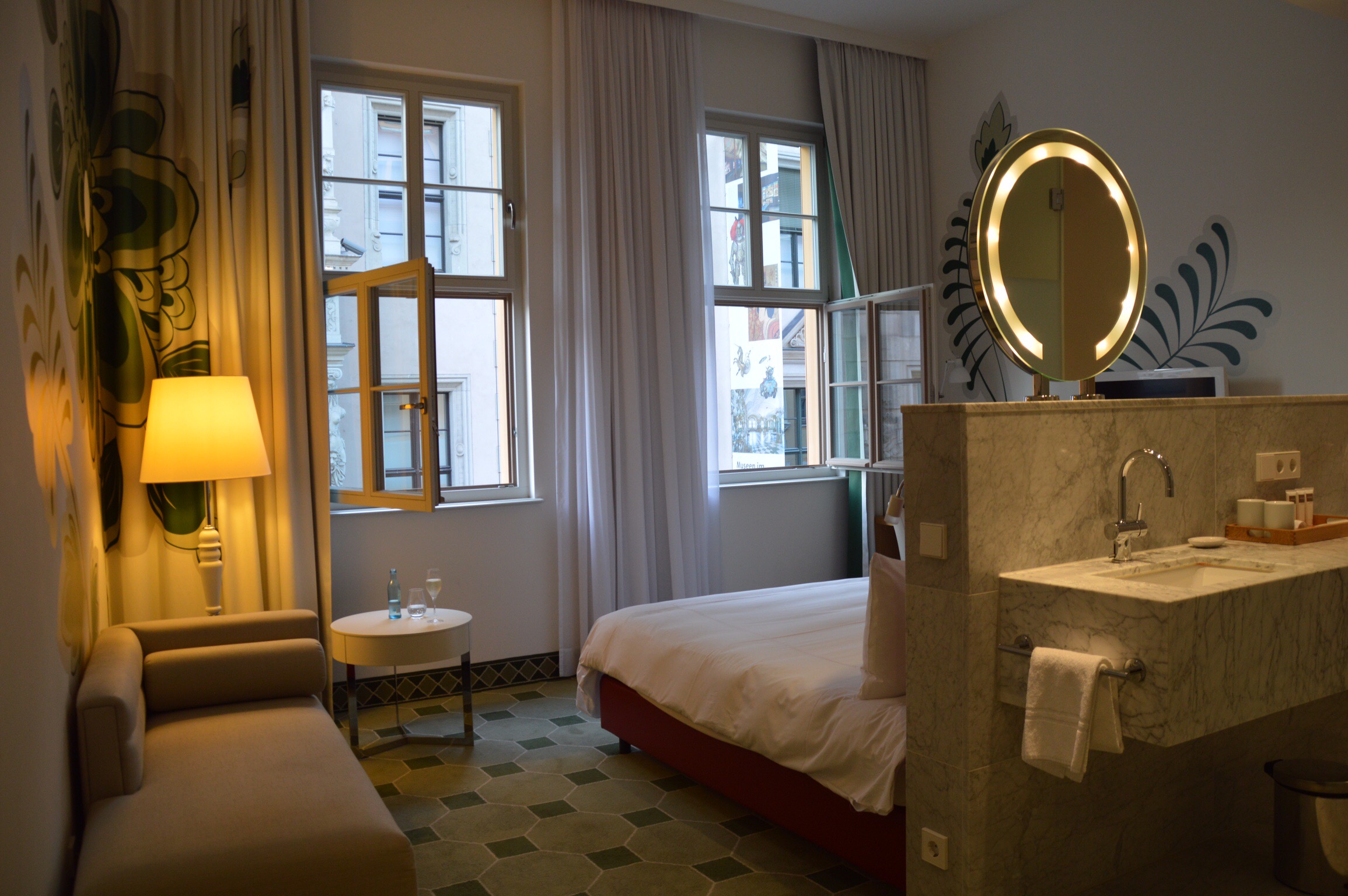 Two things made up for the lack of comfort – one was the hotel upgrade at our destination in Dresden (see first 2 photos) and the other was striking up a conversation on the train with a delightful young Danish woman on her gap year. We learned a lot about Denmark and she was interested in hearing about our travels + Australian life and politics – she was planning on studying Politics when she went to Uni. While we usually find that the upgrade to first class train travel is worth it as the luggage space, service etc. is so much better for not a lot more (nothing like the increase in prices with plane travel) – on this occasional it was lovely to chat with the friendly people around us – something that doesn’t seem to happen as often on First Class travel. There is something refreshing about the enthusiasm of youth as well and when you combine that with a sharp intelligence, like the young woman we met had, it’s often a pleasant time for all.