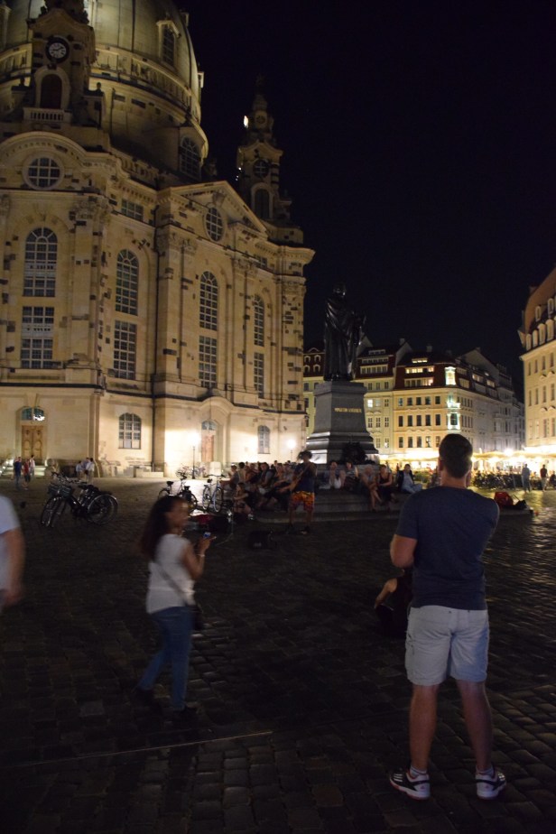 Dresden is a small, beautiful city and easy to walk around – particularly in the warm, Spring weather of mid September as can be seen from the photos. We also took a long stroll at night to see the beautiful “old” buildings lit up…of course Dresden was devastated in WWII but it has been painstakingly reconstructed, often using materials salvaged from the rubble. On warm evenings it’s vibrant in the Old Town with many different buskers…we came across a small group playing Classical music and a 10 min walk away another group playing/singing their own Reggae as well as many covers + songs of peace. We stayed for an hr & the audience kept growing as can be seen in photo – photo is a little dark but the backdrop of glowing buildings added to the general ambience. More to come…
