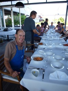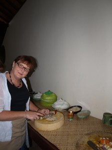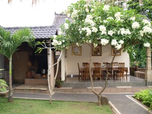 Shame Tony has his eyes closed in 1 of us together but as can be seen in the background, a beautiful tropical setting for a cooking school. The picture to the left is where we sat down for dinner that night. This cooking school is run by a local woman who worked as a cook at one of the big hotels in Kuta. She decided she could extend her family home in a village near Ubud and has been doing so ever since – highly recommended (will note the name of it once I check our journals). We also did a cooking course with Janet De N (will check the spelling shortly) – her cooking school is “Casa Luna” (see apron in top photo). Janet has written a wonderful book on Balinese cuisine (which we purchased). Janet is Australian but now lives in Bali (she married a Balinese man). Our last cooking course was in Seminak (not too far from Kuta) – will insert a map below soon. Off to the dentist now for a checkup:)