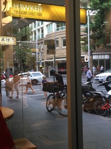 Back to nearby foodie places in Sussex Street. This was one casual eatery we enjoyed – recommended in the Australian Good Food Guide. The food was very good/quite reasonable prices (for Sydney!) – classic dishes done well…expect a crowded, noisy place so not one for a romantic night out just good/fast fun! There are many places like this along the same street – a popular place with a younger crowd including business people (CBD just up the hill – 10 min walk) and very different to the Sussex St I remember as a child in the 60s when my Dad worked at one of the offices along here. The Architecture along the street is very interesting too – ranges from the historic pub (photo above), to the beautiful old school (built in the late 1800s) to old converted warehouses to the elegant lines of Art Deco design like the building you can glimpse in the photo below. As we sat in this window we found the comings and goings of people interesting to watch…at one point a group of brightly coloured Thai dancers in traditional costume crossed the street. Probably headed toward one of the larger restaurants – maybe on the west side of Darling Harbour…a very popular area for tourists and consequently often a lot more expensive.