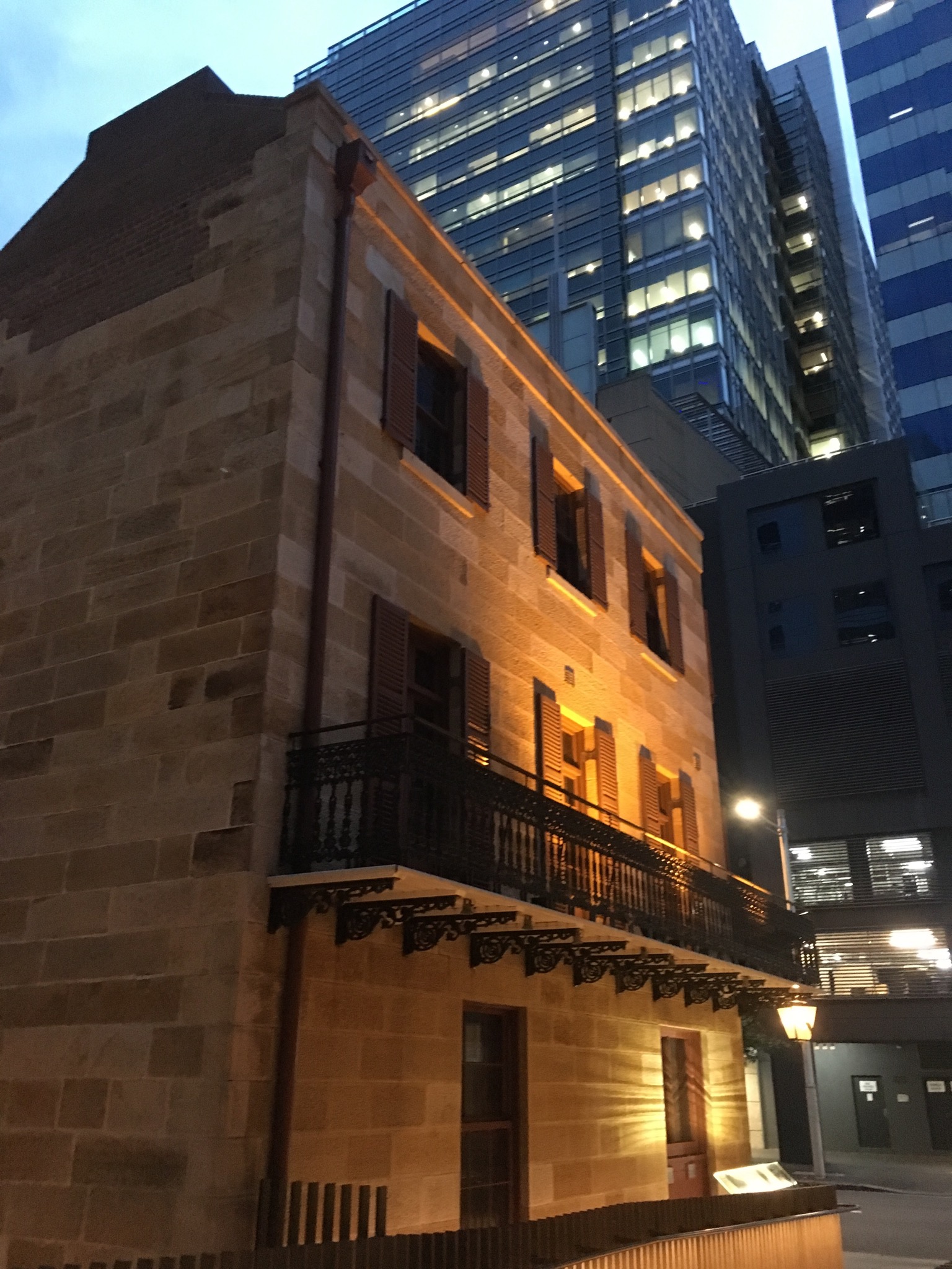 To left – The Dundee Arms Hotel: built in the 1840s. It is one of the oldest surviving pubs in the area. It served the sailors from the ships docked in the harbour, workers from the warehouses of Darling Harbour and the shopkeepers in the Corn Exchange next door. It had a hotel licence until 1888 and then became a home to many interesting residents including T.J. ‘Buttie’ McMahon – grandfather of Australian Prime Minister Sir William McMahon. Also a home to award winning artists Rod Shaw, Graeme Inson and Ivy Shore.