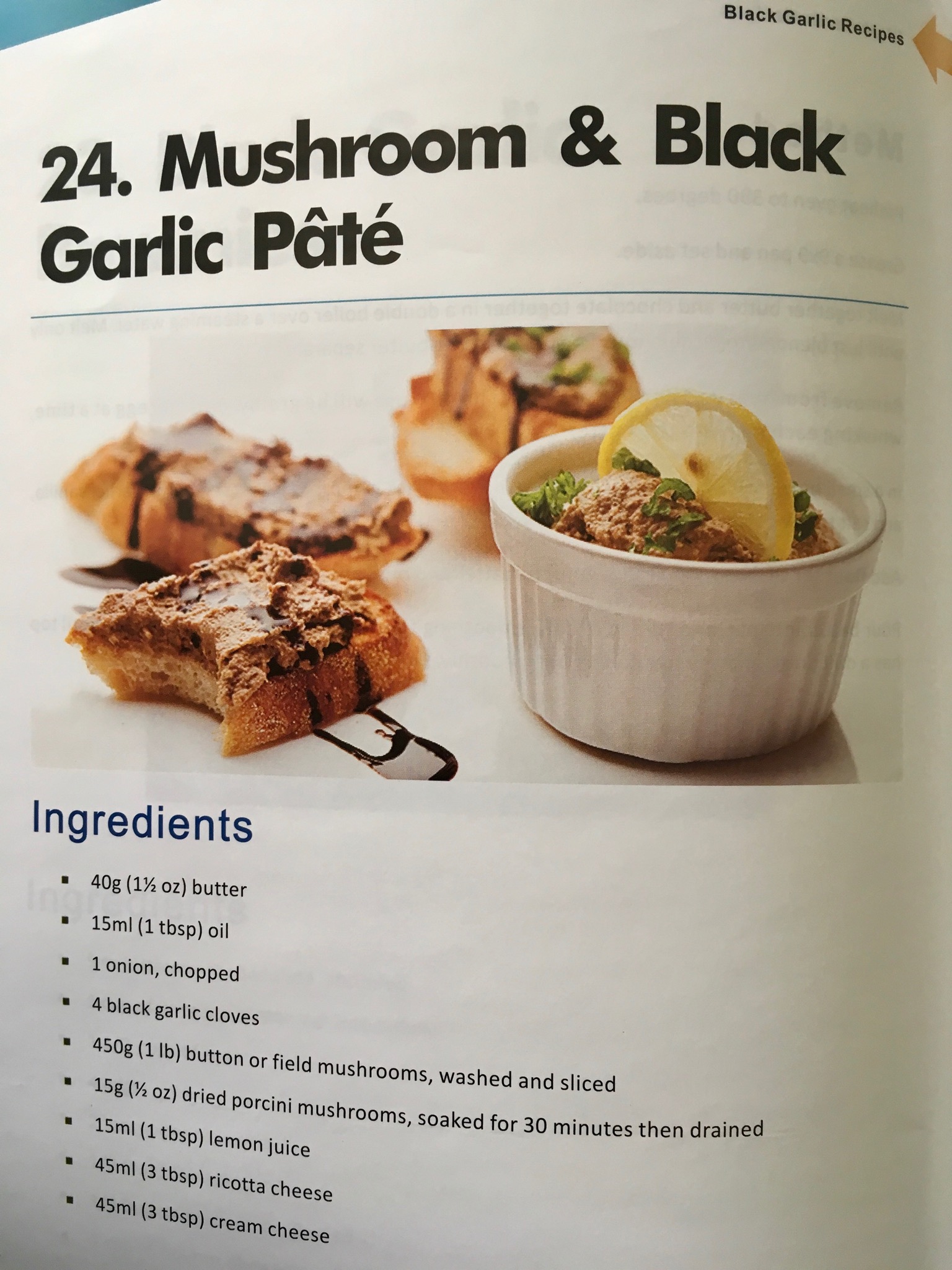 So today when we made one of our regular visits to the Canberra Bus Depot Markets in Kingston we not only purchased some black garlic but we also the supplier’s (Bredbo Black Garlic) recipe book. We were so pleased to find the recipe for Mushroom & Black Garlic Pate in it (photo below):