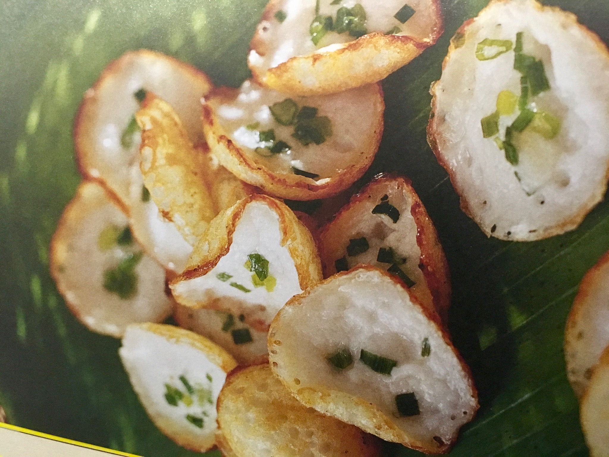 Above photo on left is “Asparagus Stir Fried with Prawns” in David Thompson’s book – Thai Street Food (P230) one of the simplest dishes in the book! The photo on the right is of “Thai Cup Cakes” (P14 in Breakfast section) – more like crisp wafer cups with creamy coconut centres. The coconut filling is sweetened with sugar and the traditional green onion on top is optional. We haven’t cooked them ourselves but we tried them from a Street stall recommended on the Taste of Thailand walking tour mentioned above…quite addictive!