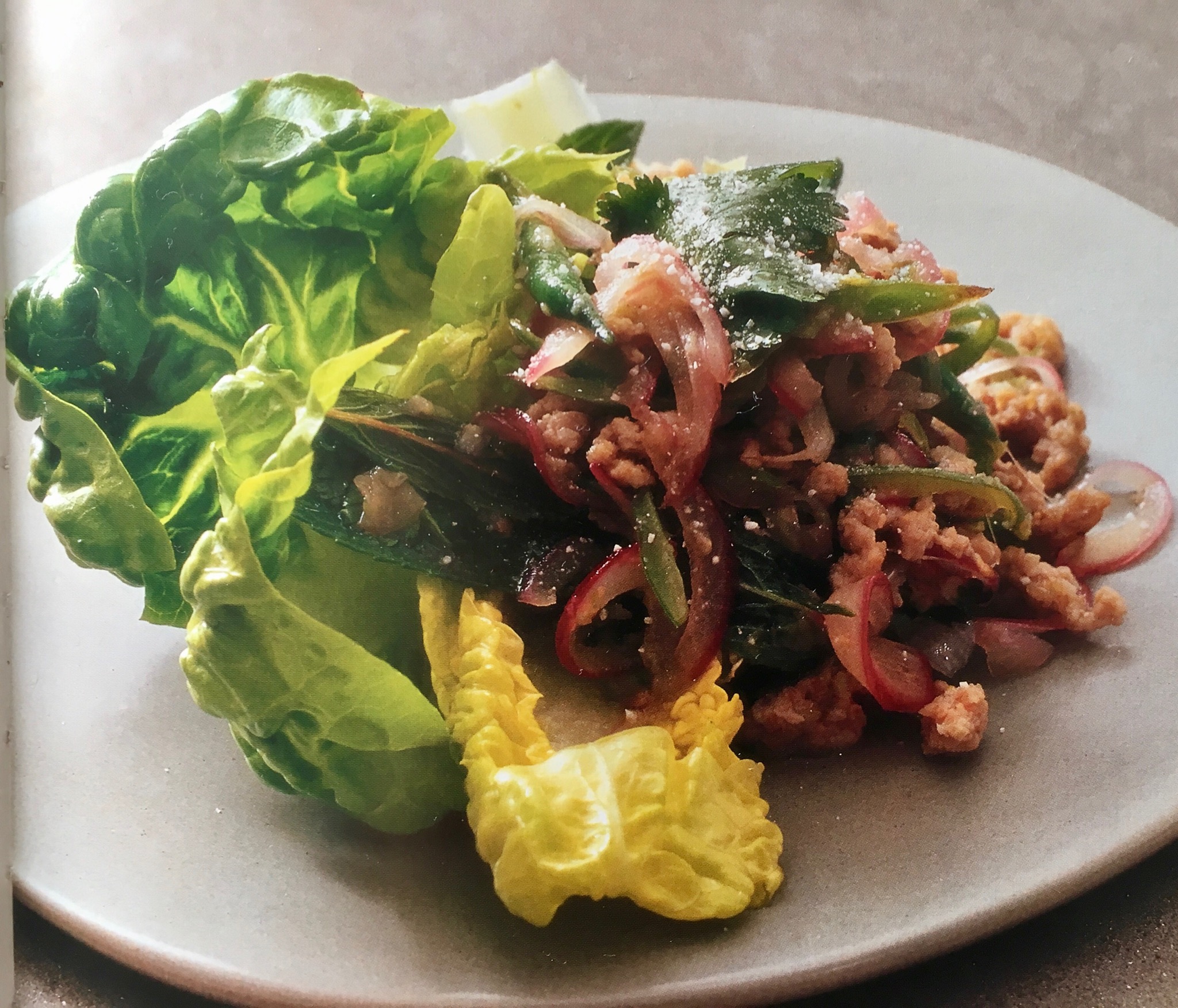 Photo above: Warm Salad of Spicy Minced Chicken (P70) – Known as “Larp” or salad in the North of Thailand although it’s really a stir-fry served on lettuce. I love the combination of the lime and chilli (adjust chilli to taste). Neil Perry says it’s a lot like a “Thai Sang Choi Bao”.