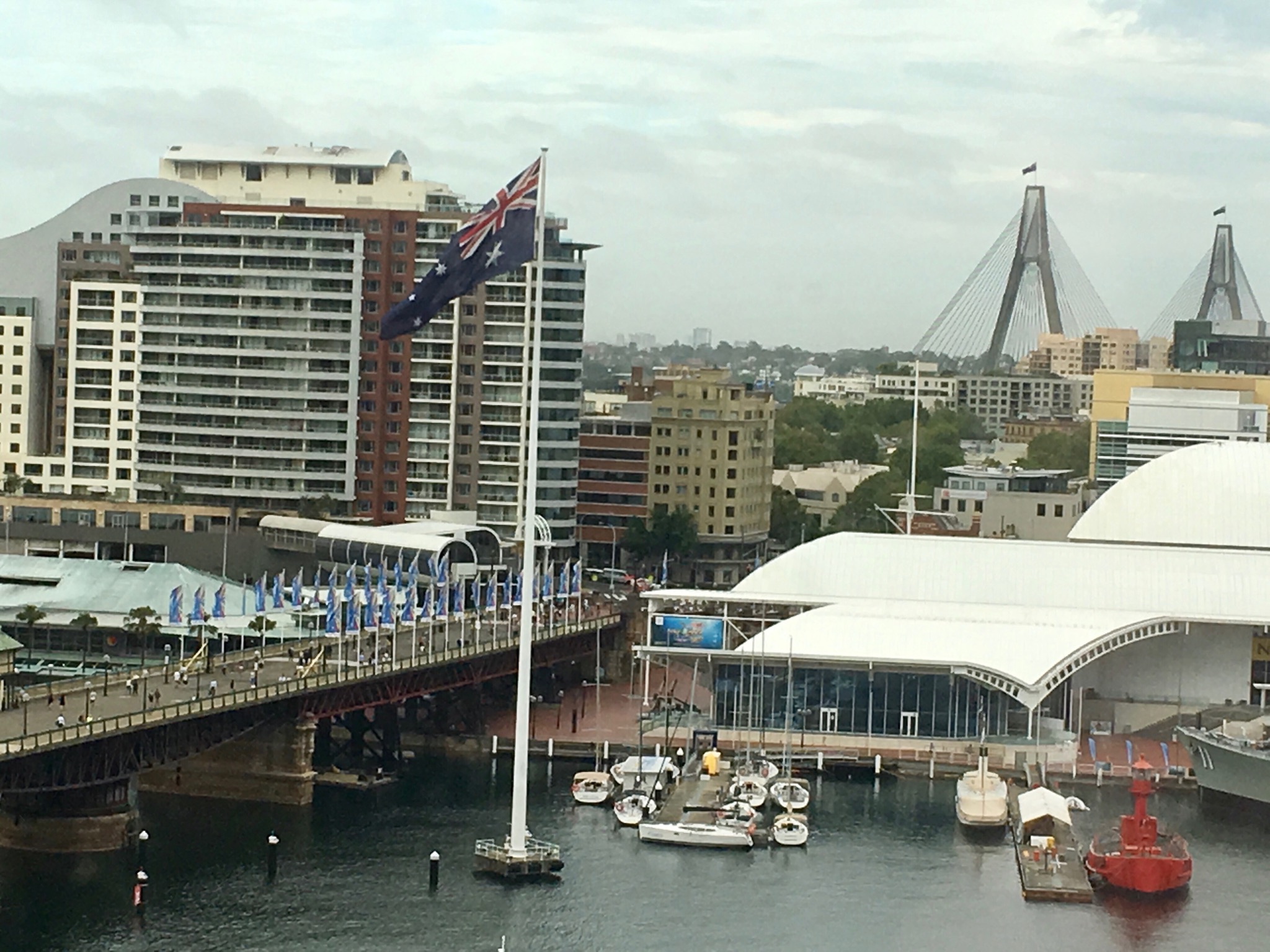 Photo to right: view from Hotel (Hyatt Regency) to Western side of Darling Harbour, Sydney – the pedestrian bridge can be seen on the left; the Maritime Museum on the right displaying a small lighthouse and many ships including old sailing ships to modern vessels (see other Sydney posts).