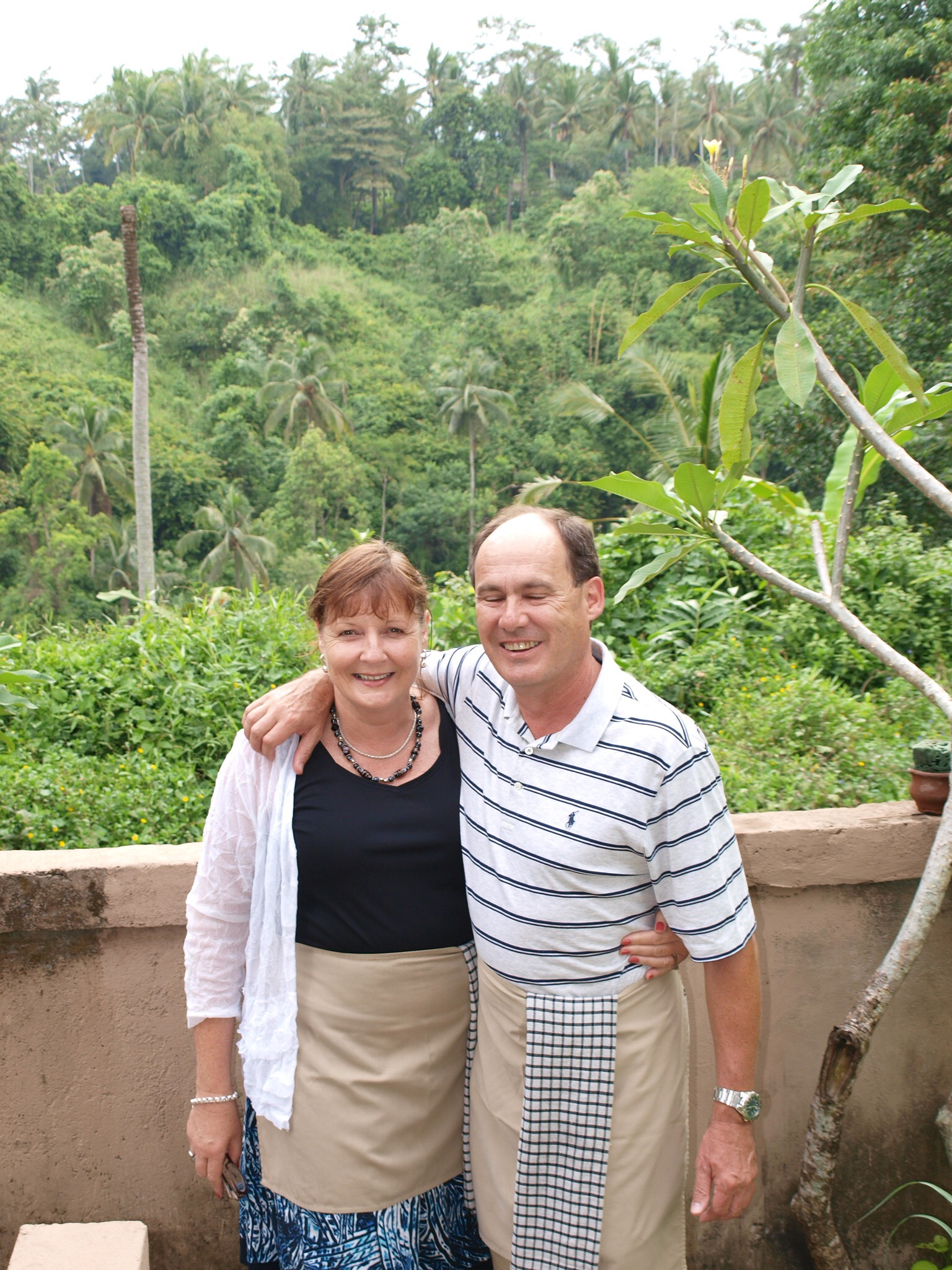 Shame Tony has his eyes closed in 1 of us together but as can be seen in the background, a beautiful tropical setting for a cooking school. The picture to the left is where we sat down for dinner that night. This cooking school is run by a local woman who worked as a cook at one of the big hotels in Kuta. She decided she could extend her family home in a village near Ubud and has been doing so ever since – highly recommended (will note the name of it once I check our journals). We also did a cooking course with Janet De N (will check the spelling shortly) – her cooking school is “Casa Luna” (see apron in top photo). Janet has written a wonderful book on Balinese cuisine (which we purchased). Janet is Australian but now lives in Bali (she married a Balinese man). Our last cooking course was in Seminak (not too far from Kuta) – will insert a map below soon. Off to the dentist now for a checkup:)