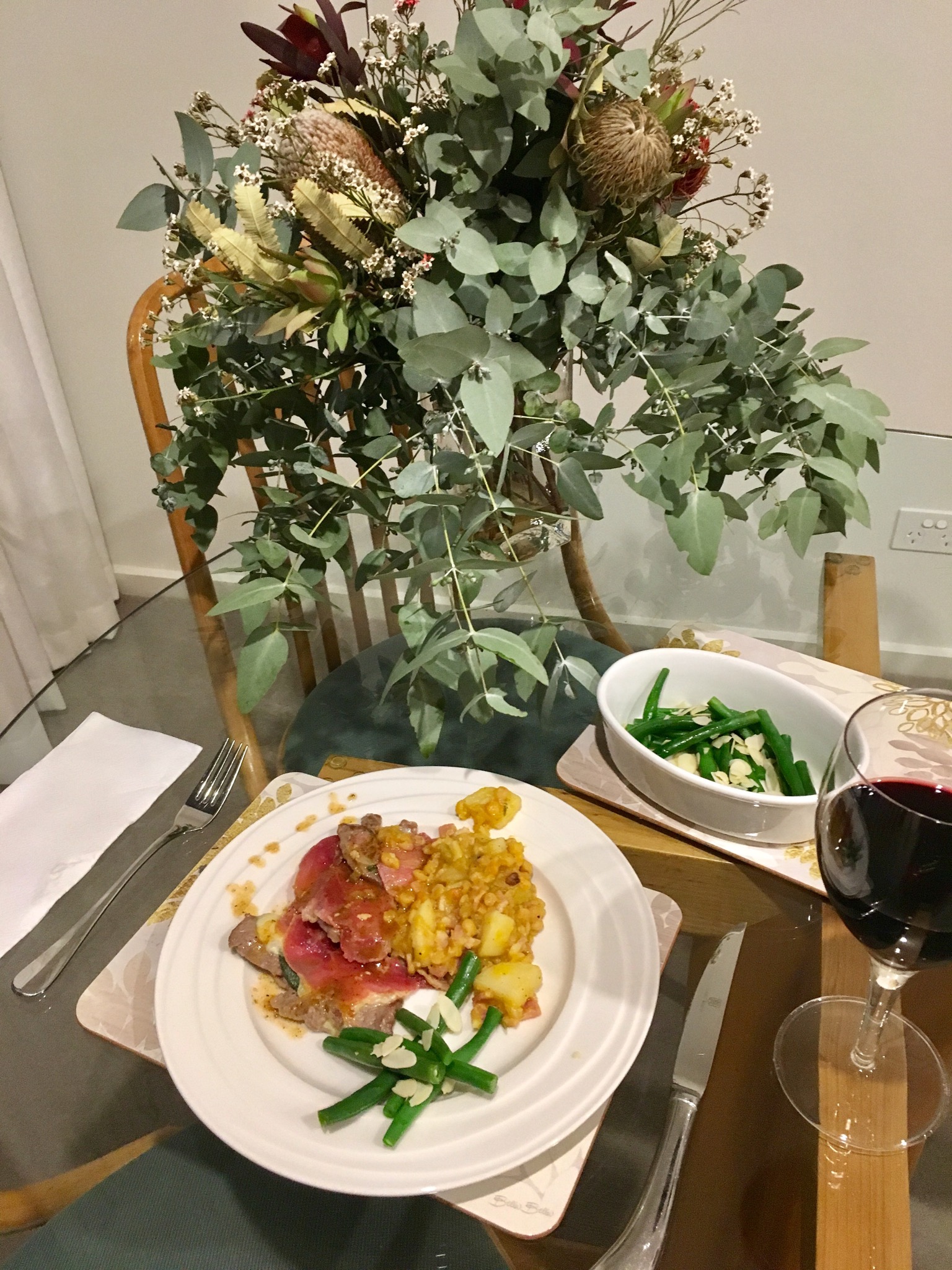 Those from countries other than Australia might find the flowers quite interesting too (if you love flowers and gardens like I do?)…the gum leaves are from a tree in local bushland reserve. I sometimes return for a walk with an old friend around the hills/reserve near our old family home (about 20 min along the highway from the centre of Canberra). It’s a pretty place to visit and often there are lots of kangaroo particularly in the morning and late afternoon; sometimes just a few metres away. I’ve been walking the bush trails quite often, especially when we had a dog, and I never saw a snake and the kangaroos always hop away if you get too close. There are some rare reports of kangaroos being aggro but if you keep your distance (just a few metres…maybe a few extra if there’s a large male) it’s all very safe to walk nearby. I’m noting this because I know that there are sensational TV reports about all our “deadly animals” and occasionally that’s what people mention when we say that we’re from Australia + it’s their reasoning for staying away! The other flowers in the arrangement are banksias (Australian flowers) and protea (Sth African but now grown extensively in Australia). This bunch looked a lot brighter/fresher a few days ago when I arranged it but nice thing about Australian/Sth African plants is that they look ok when they dry out a bit too although they went into green waste this morning😉🌿
