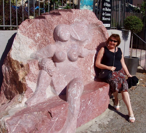 A few years ago we travelled by train from Spain to France (Montpellier). After a few days in Montpellier (a small city) we hired a car and travelled to Caunes-Minervois, a small village in Languedoc, France. It’s a quaint village and one of the unique features that attracts many people is all the pink marble – there’s even a quarry that’s open to the public now. There’s also a few galleries and a museum with a focus on artworks made from marble. You can’t miss the entrance to one gallery with the eye catching seat out the front! (photo below)