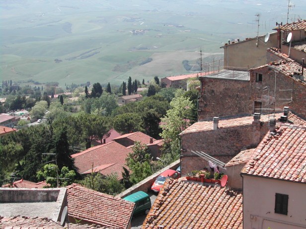 Hills of Tuscany over the rooftops of the historic town of…?…will check our journal as we visited a few small towns a short drive from the countryside villa where we stayed for a week.