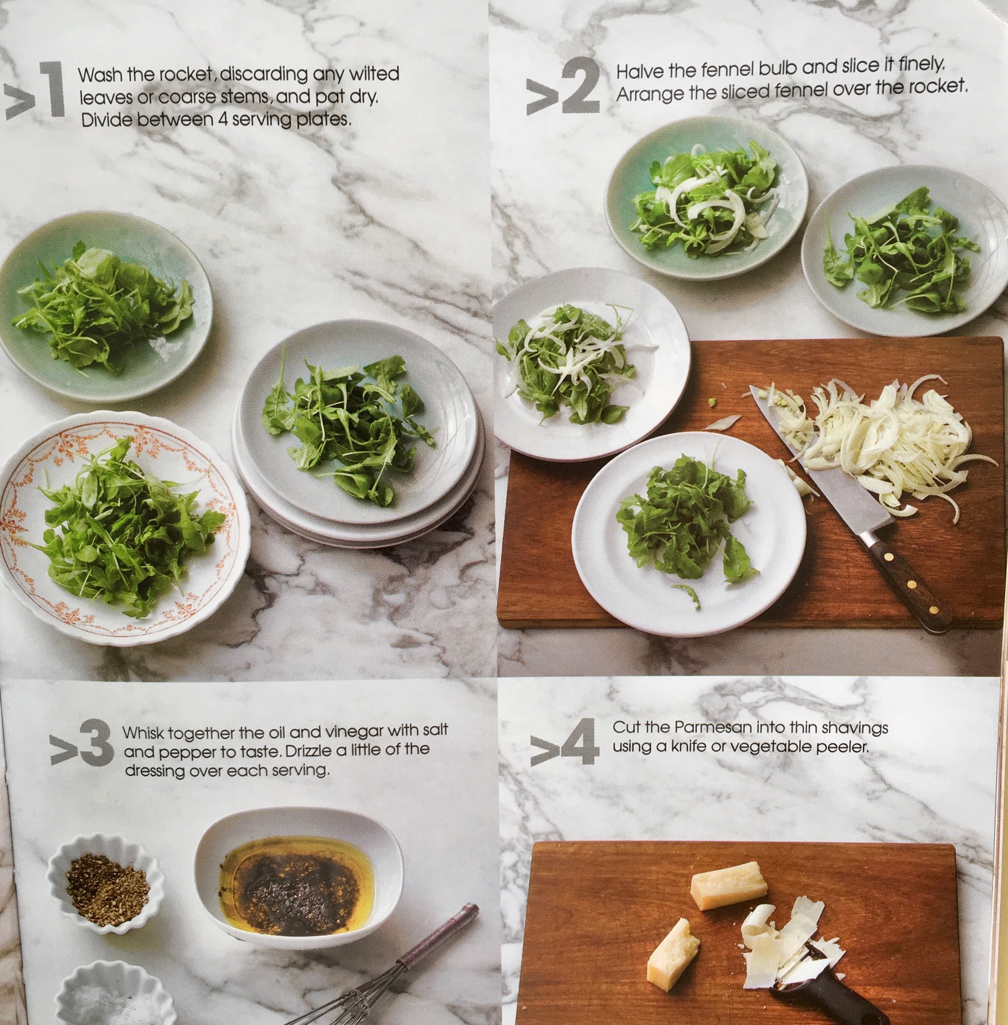 2 handfuls rocket leaves; 1 small fennel bulb; 5 tbsp olive oil; 2 tbsp balsamic vinegar; 100 g parmesan cheese; 50 g pine kernels; salt and pepper.