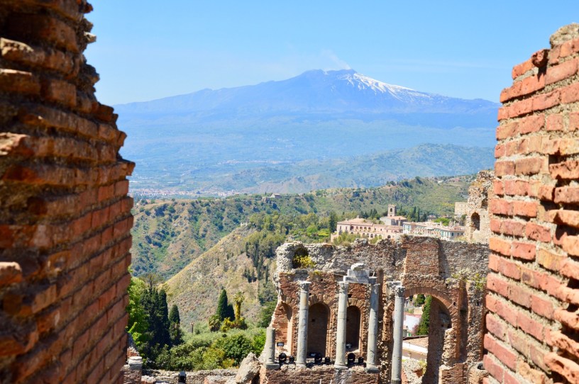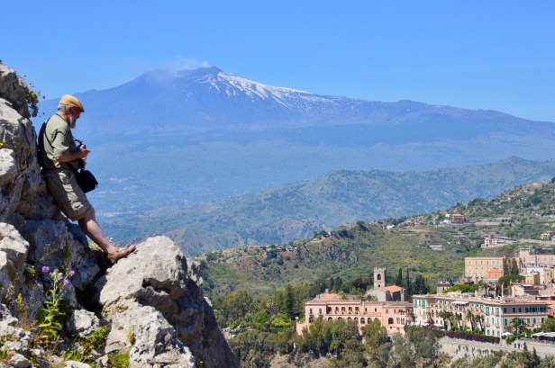 Photo below: This photo looking toward Mt Etna (that is smoke not cloud coming from the volcano!) was taken at a high point not far from the amphitheatre. As I write this I’m aware that this volcano erupted unexpectedly this year (2017), injuring quite a few people. The adventurous photographer in this picture stood there for ages…just taking in the beauty before even thinking about taking photos.