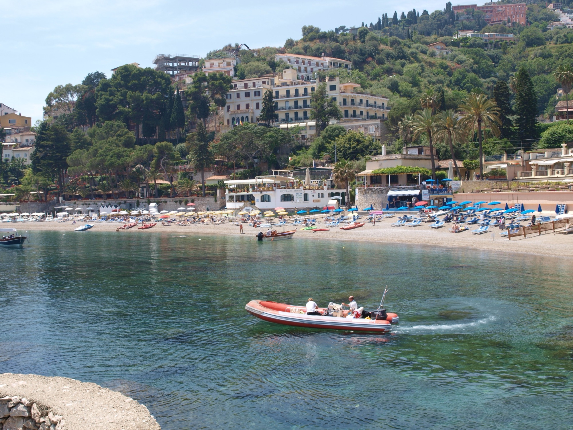 Day trips to the seaside below the town: Lots of pretty, pebbly beaches but rather hard on the feet so it’s worth taking some waterproof beach shoes – there are many for sale in the Taormina shops at quite a good price, compared to Australian stores. There were even vendors selling beach shoes along the waterfront!