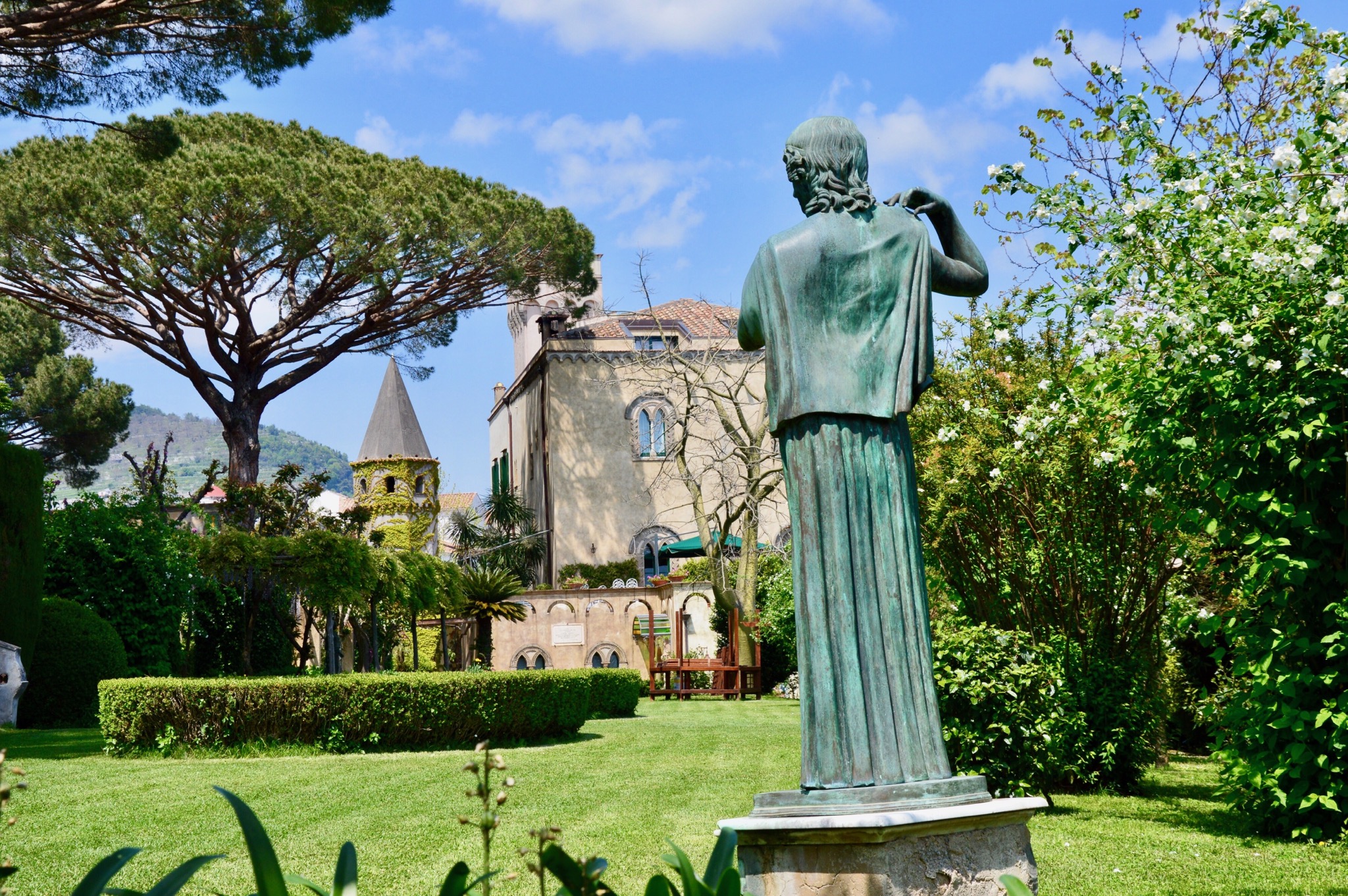 I took the above photo on the walk up. I love this photo…particularly the texture of the tree trunk in contrast to the softness of the flowers and clouds but also the perspective, and how the tree framed the view as we walked up the hill to the Cimbrone gardens in Ravello.