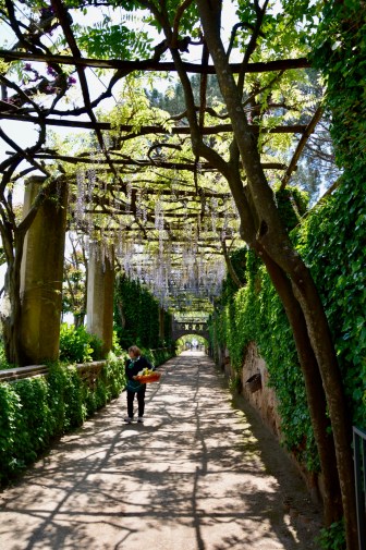 On our walk from the centre of Ravello to the hilltop gardens, the beauty at each turn was breathtaking. The entrance to the gardens can be seen in the photo below – the wisteria and filtered light was stunning and the weather was perfect…not too hot for an exhilarating walk.