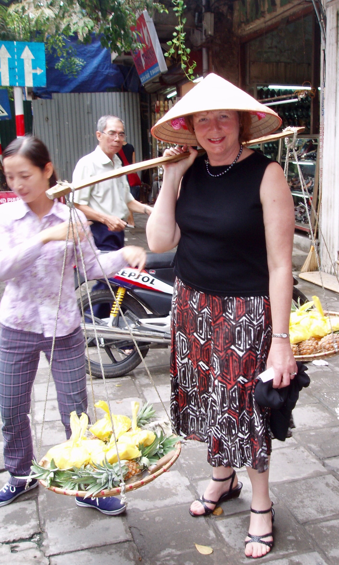 Photos below: On the streets of Hanoi…on the right you can see the man in the background has a concerned expression. Shortly after Tony took this photo, the man came up to us and said “overcharged!”. I gather the women on the left we borrowed “the props” from was his wife’s rival and in his opinion $1 was too much. She had a young child to feed so even if she did overcharge, we didn’t mind!