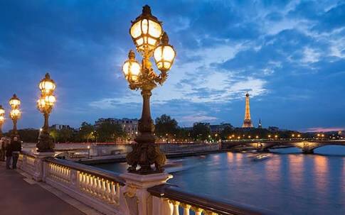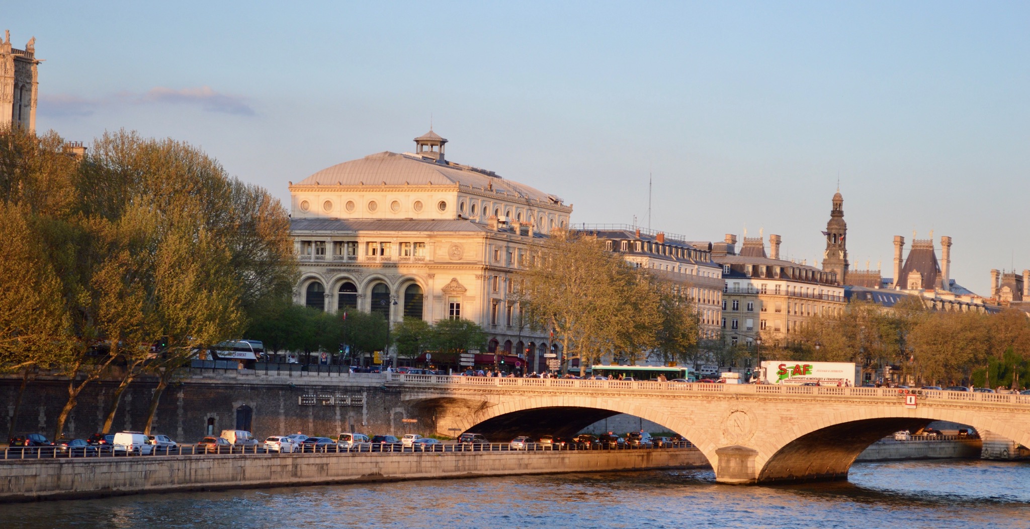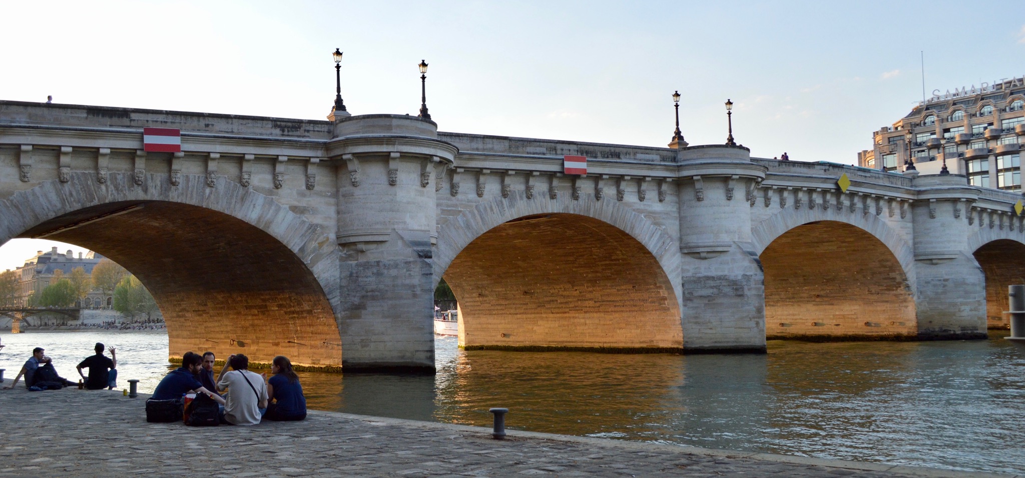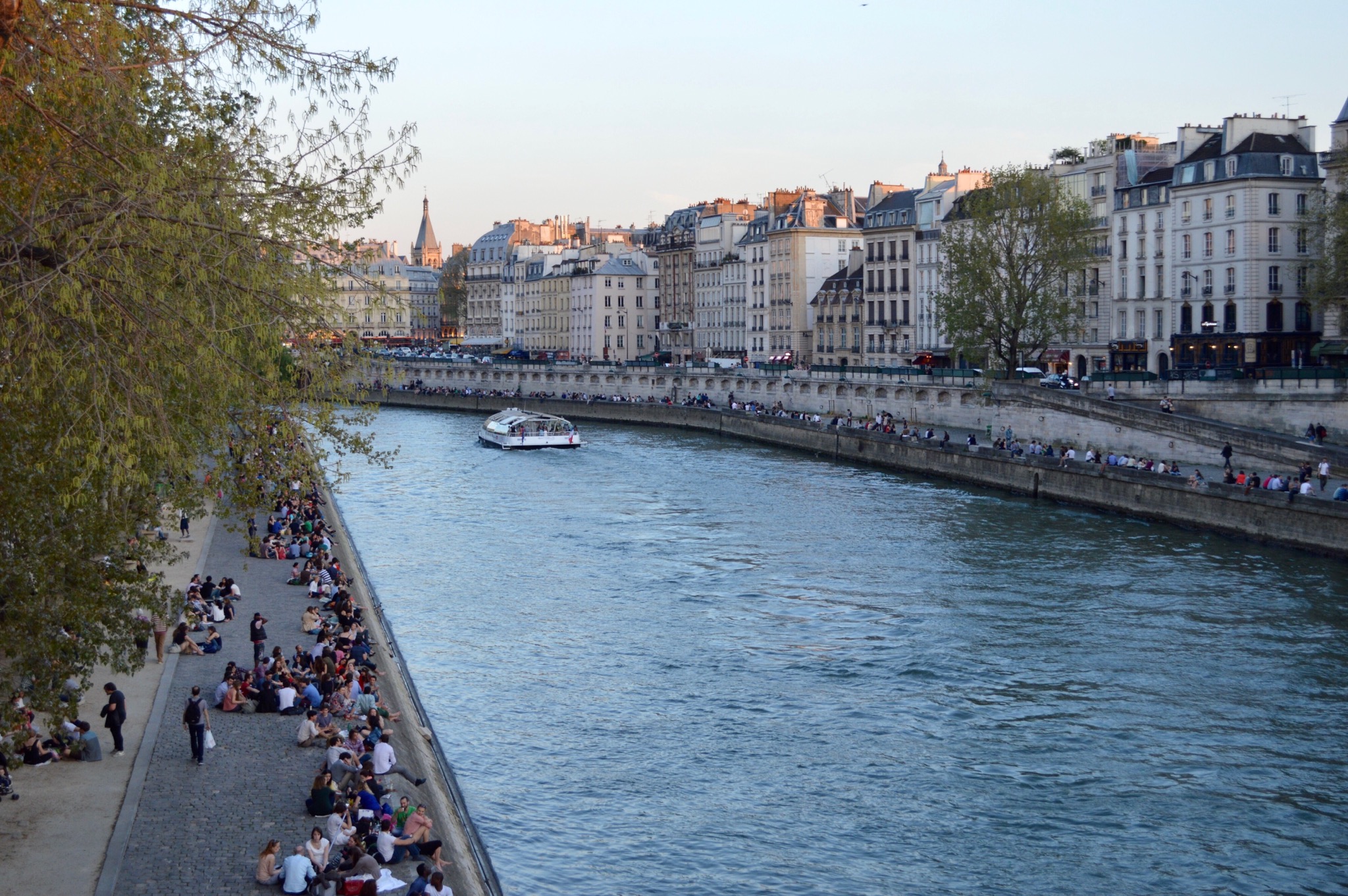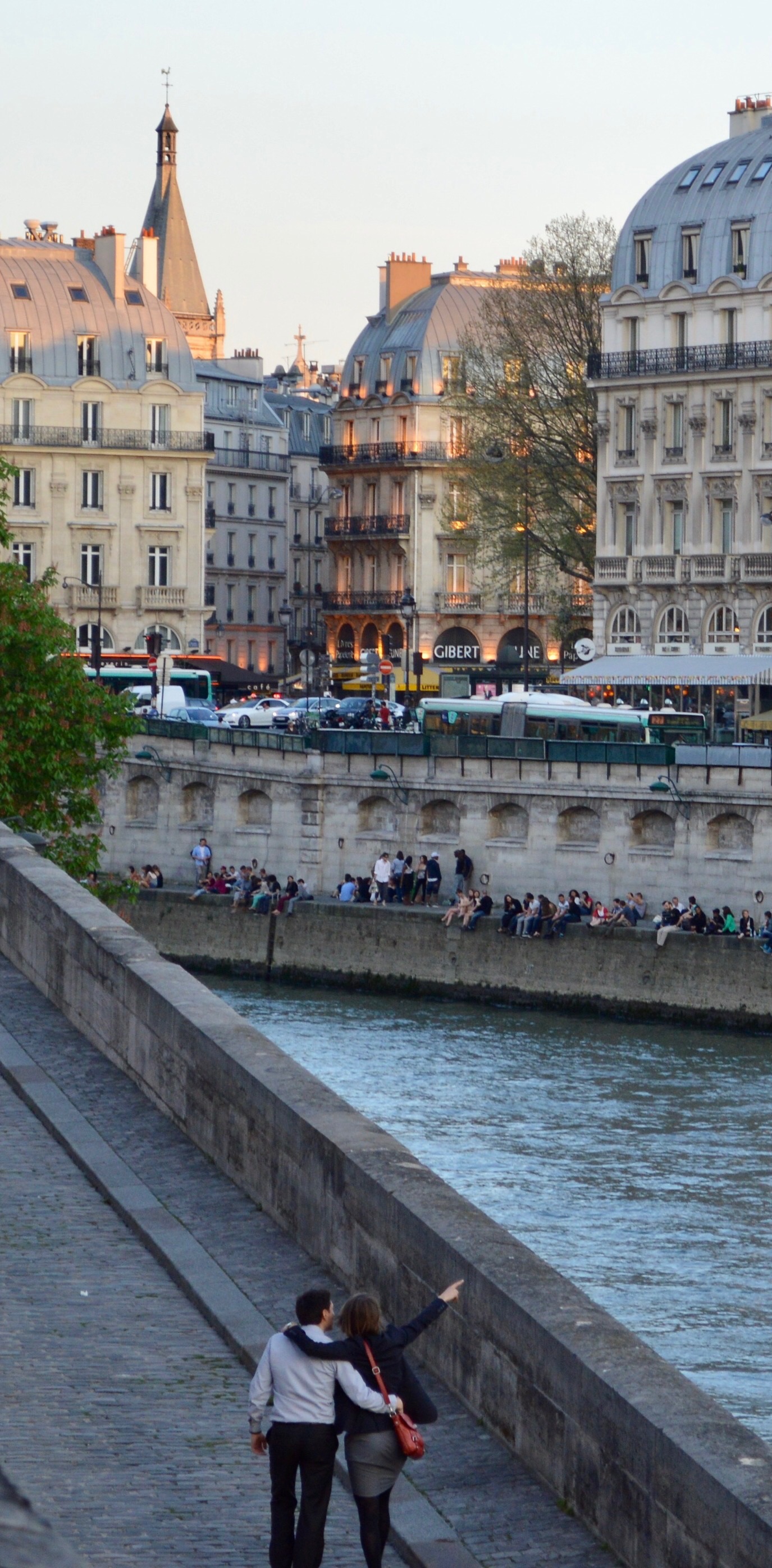 Photo below: So romantic!…with the couple in the foreground and the evening glow on the buildings. It was a very warm evening with people up and down the Seine.