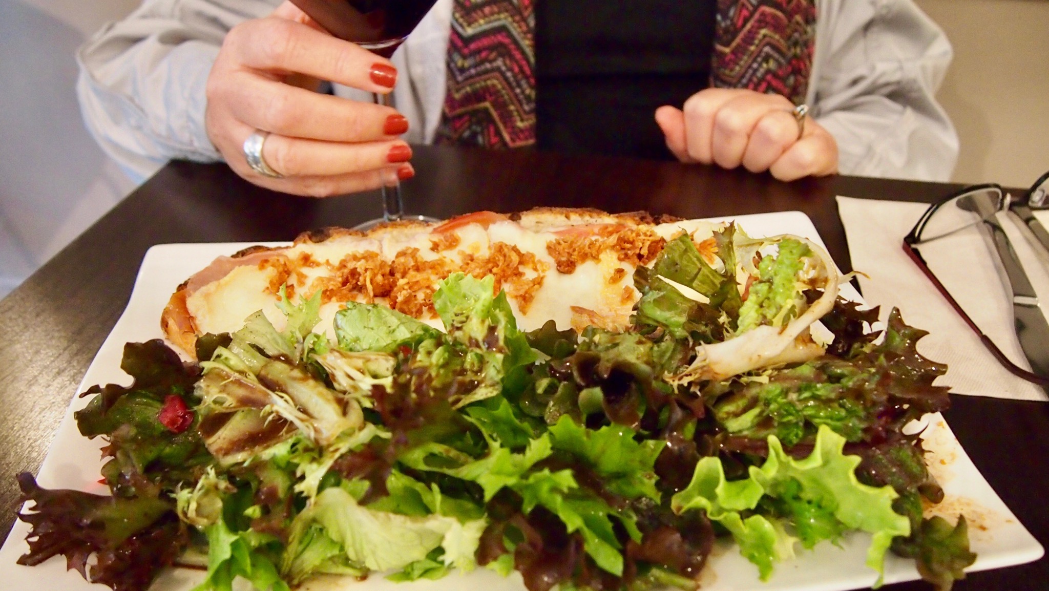 The photo of me in the Bistro above was taken after a freezing cold day at the WWI Battlefields/Memorials/Museum at Villers–Bretonneux – a highly recommended day trip from Paris – see earlier blog post if interested. Amazing thing was that the day before (Anzac Day 25/4/13) was a heat wave in Paris and Villers-Bretonneux. I hadn’t packed clothes for very cold weather so at the end of a long, cold day, finding this cosy little bistro/pizza place was delightful, plus they served good food as can be seen below.