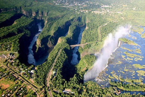 Photo below: An aerial photo from the Net. A helicopter flight is available (at quite a high price of course) but we decided not to do it as, when we were visiting, there was a lot of mist obscuring views from above. We have heard that it can be fabulous but we had spent a lot on our hotel room (see next post) – Victoria Falls is quite an expensive place to stay although there are also back packer places etc. where accommodation costs can be a lot less of course.