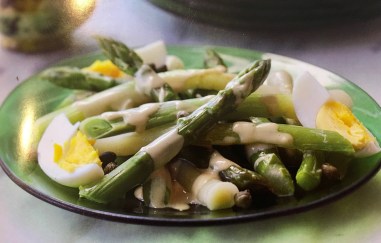Method: Summarised – hard boil eggs; Slice leeks & asparagus into 9 cm lengths; Steam or boil until just tender – drain & rinse under cold running water; drain again; add vinegar & garlic to mayonnaise + S&P; toss dressing & veg together & chill for at least 1 hr; just before serving put eggs & capers on top.
