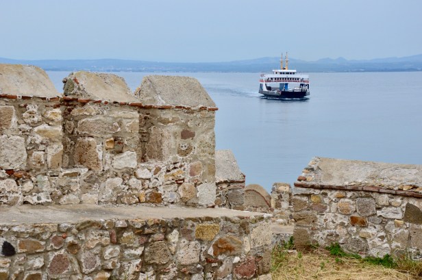 We travelled by public ferry from the mainland to the Turkish Island of Bozcaada. It was a short and easy trip – only about an hour. Tony stood with the bags and took in the view. I did a bit of that but wanted to check out the little kiosk they had on board – it was set up with tables and most people were sipping Turkish tea. There were also some small sweets on offer including Turkish Delight and simple biscuits which looked homemade. All very nice on a public ferry trip!