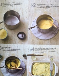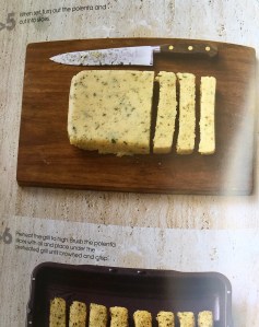 Ingredients: 1 litre water; 200 g instant polenta; 25 g butter; 1 tbsp fennel seeds; 2 tbsp finely chopped fresh flat-leaf parsley; olive oil (for brushing); S&P + I add grated Parmesan cheese on top at the end. Delicious if grilled/melted on top!