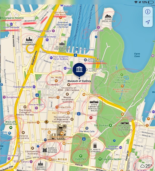 A PARTIAL MAP OF INNER SYDNEY WITH MANY PLACES WE’VE ENJOYED HIGHLIGHTED IN RED…all an easy walk from where we stayed (Google Maps)