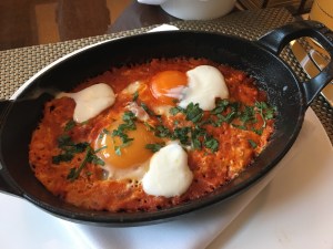 I did try an Indian breakfast a few times, including some local breads with lentils (sometimes called Daal). At home, Tony and I often served Daal as a side dish to an Indian curry (recipes in a future post). However, many Indians have Daal for breakfast and sometimes for other meals during the day as well. Here’s a photo of some baked eggs I enjoyed for breakfast one day – in a mildly spiced curry sauce…