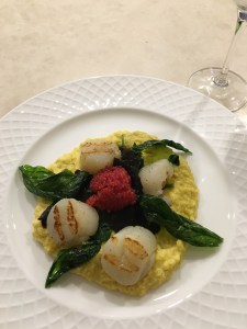 Scallops with sweet corn puree, prosciutto and lemon butter
