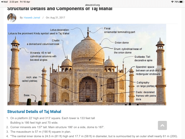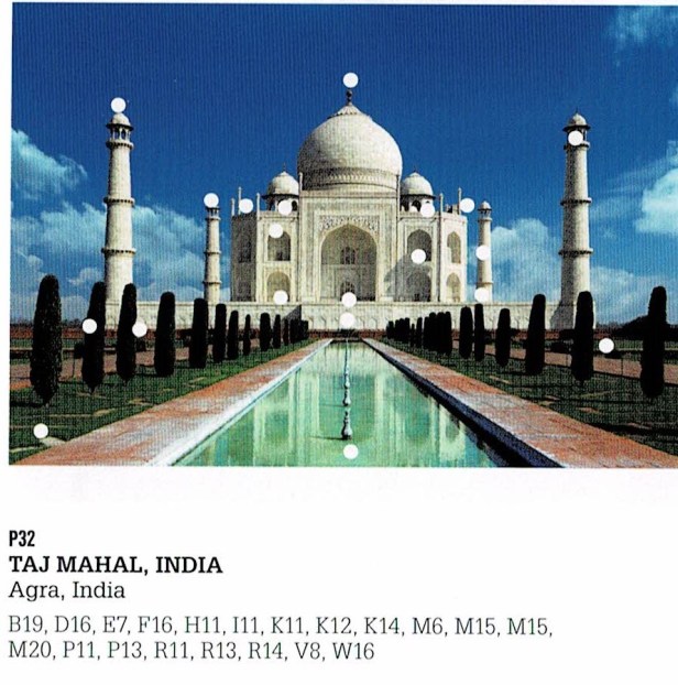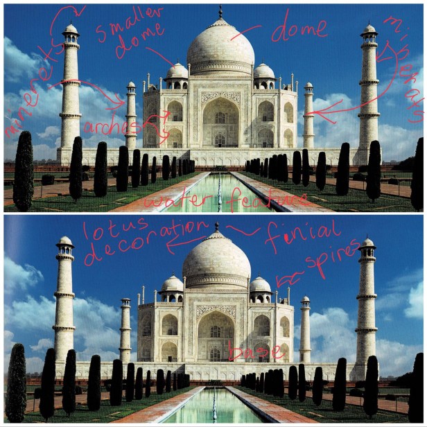 TAJ MAHAL – SPOT THE DIFFERENCE GAME for kids…and maybe adults…from a book I purchased from Paperchain, Manuka, Canberra – comparing architectural icons from around the world…have children take turns to spot a difference…the child who spots the most is the winner (there are 20 differences); of a draw if 10 each of course although bonus points could be given for correct use of architectural feature eg. Minerat