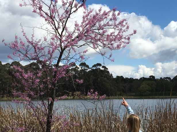 Can you see the little blue wren she’s pointing to in the blossom tree? A common sight in Canberra.