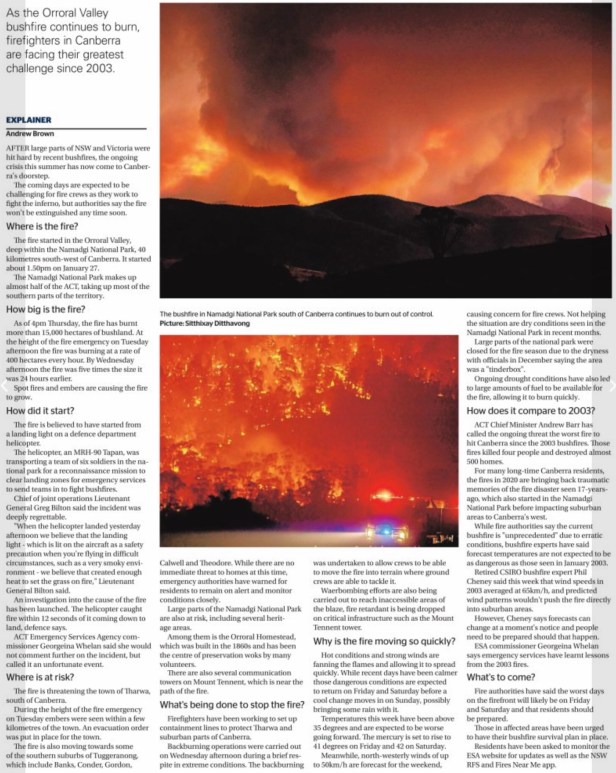 On returning to Canberra from the devastated NSW South Coast in early January 2020, we were once again had fires on the city’s urban fringes – close to homes of family and friends. Fortunately Canberra has learned so much from 2003 fires and no ACT homes were lost. Unlike 2003, we felt safer as we have sold our family home in Theodore (photo below) and now live in an apartment in the inner South of Canberra. However, Theodore is also in the South and is only a 15 min drive along the Monaro Highway (heading toward Cooma/Snowy Mountains) so we sometimes visit old friends who live there. I was a teacher at Theodore Primary School from 1990 – 1995 so made a few close friends over my time working and living there. Here’s an article from the Canberra Times in January this year – 2020…