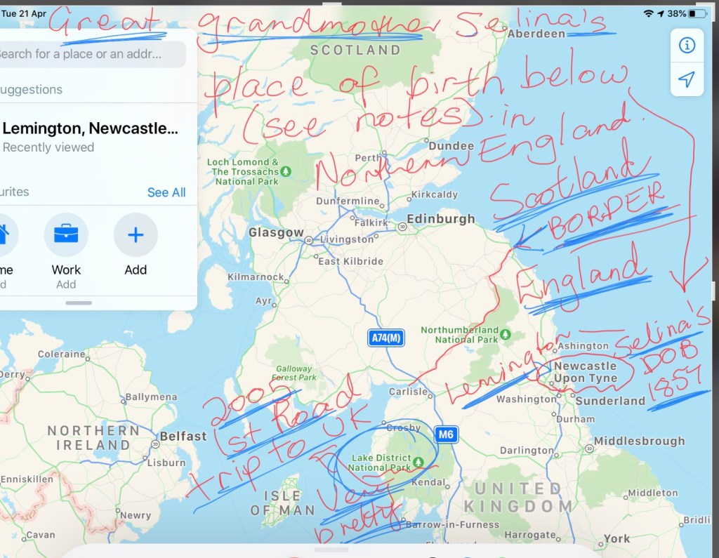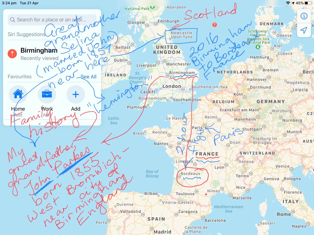 My sisters, cousins and I have a family connection to the Birmingham region as our great grandfather originated from a town not far from Birmingham (West Bromwich)…noted in my rough notes on map below…