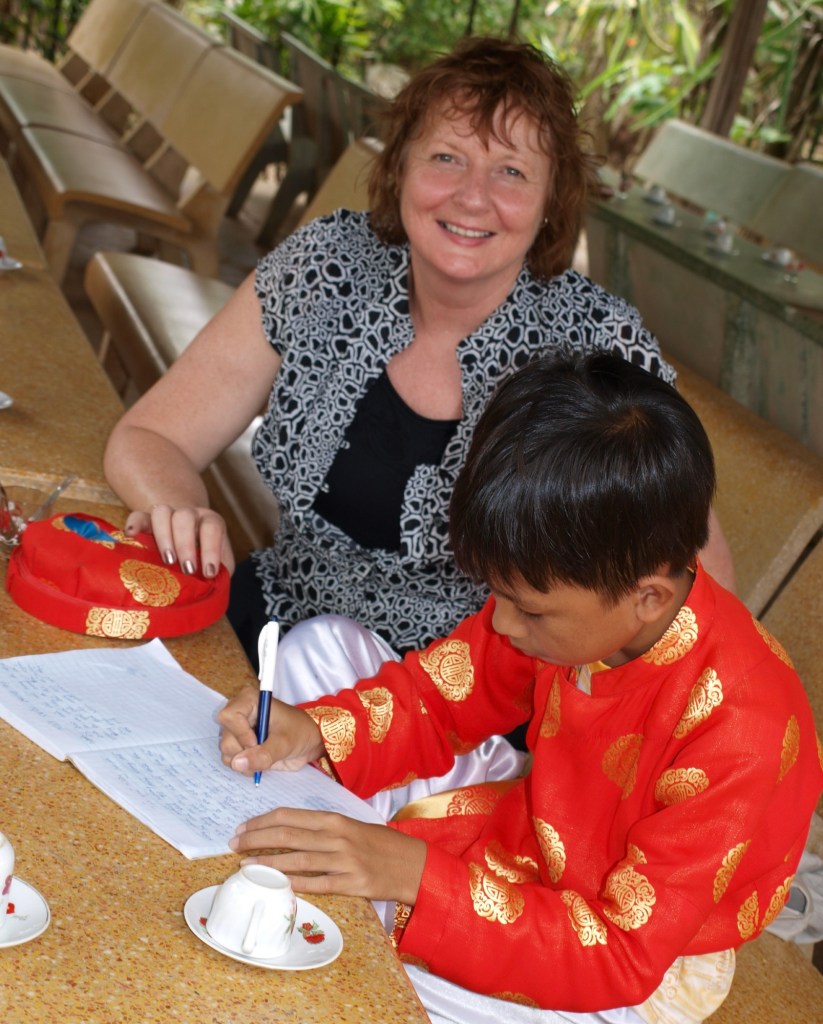 We did a small group day trip along the Mekong river stopping in the mid afternoon for lunch…the restaurant was set up for larger tour groups (as can be seen in image below) but the small group lunch was delightful; afterwards the chef’s son heard I was a school teacher so came over for assistance with his English homework. It was such a wonderful day! I remember it being hot and humid (hence the curly fringe!) and wondered why the school uniform had long sleeves…it was certainly eye catching though!