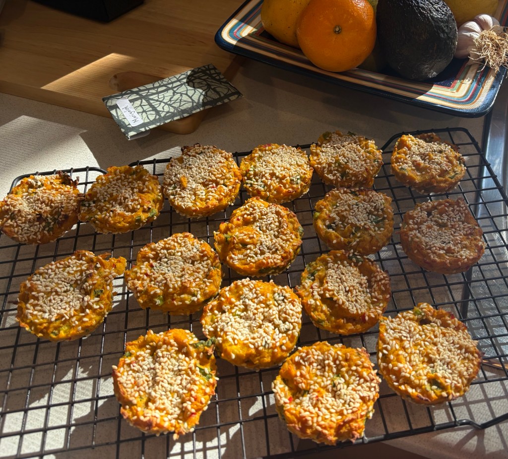 We made these at the coast a few weeks ago…a meal for ourselves, then we froze the rest as we had friends coming for lunch a few days later. We simply shallow fried them just before serving…along with Tony’s favourite terrine; some crusty bread + a green leafy salad.